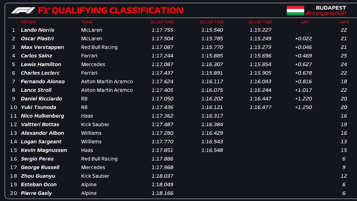 Норріс у своїй найкращій спробі випередив напарника Оскара Піастрі на 0,022 секунди. Третім став Макс Ферстаппен із Ред Булл, який програв переможцю кваліфікації 0,046 секунди.
