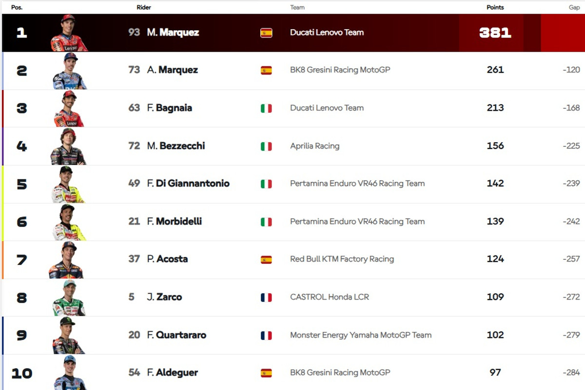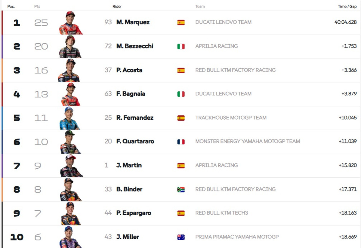Сьогодні в Брно Маркес випередив італійця Марко Бедзеккі з Aprilia та іспанця Педро Акосту з КТМ. Четвертим фінішував дворазовий чемпіон світу, італієць Франческо Баньяйя з Ducati.