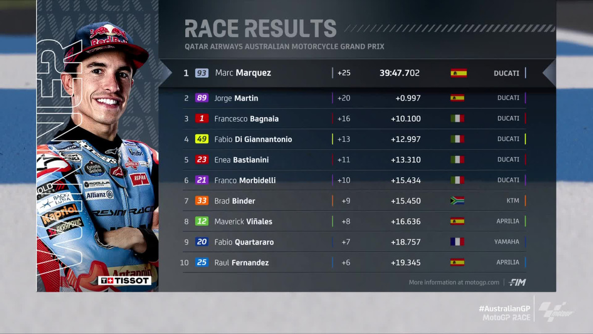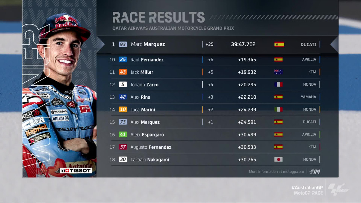 На останніх колах між Маркесом та лідером загального заліку Хорхе Мартіном (Prima Pramac Racing) розгорнулася боротьба за перше місце. 31-річний Маркес менше ніж на секунду випередив свого земляка. Для нього це третя перемога у сезоні.