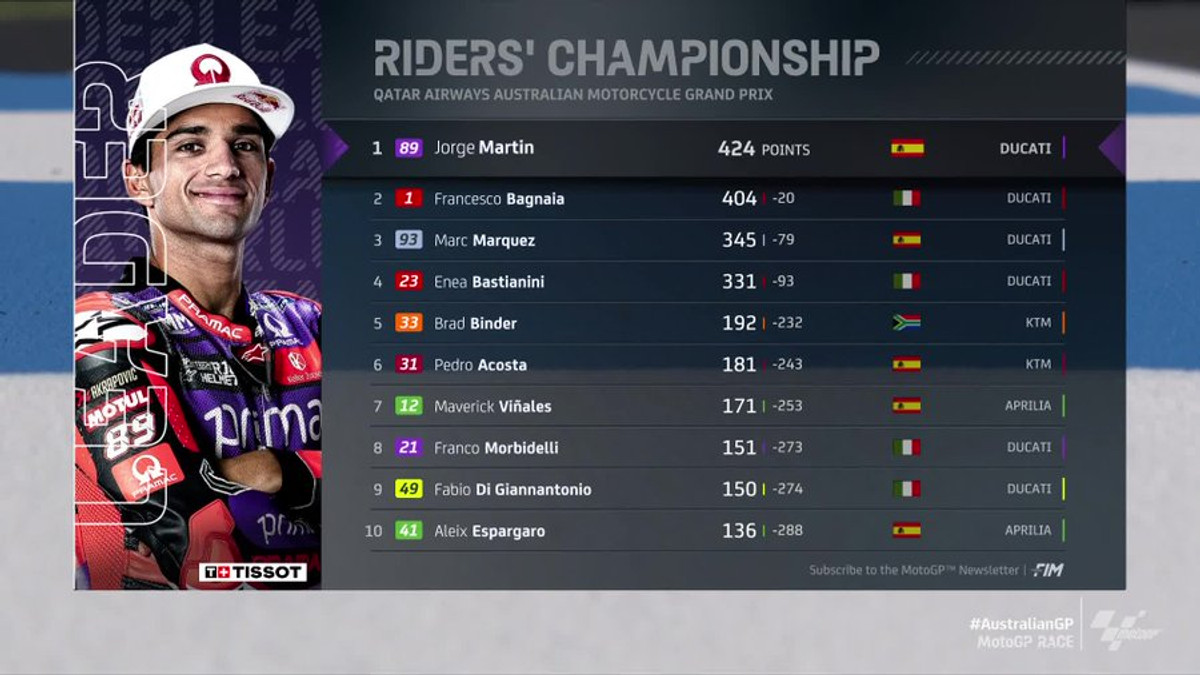 Чинний чемпіон Франческо Баньяя з команди Дукаті фінішував третім. Тепер він відстає від Мартіна на 20 очок.