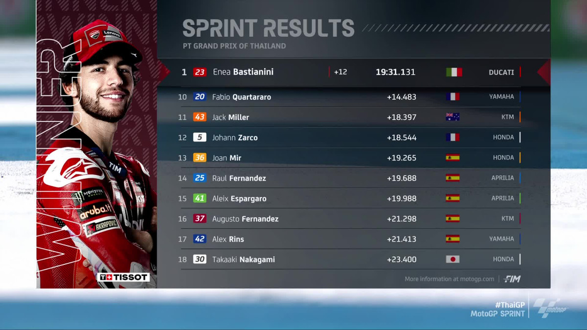 Тепер Хорхе Мартін має 433 очки. Баньяя, який є чинним чемпіоном MotoGP, відстає на 22 бали. Перемога Бастіаніні додала йому 12 очок і тепер у нього 343 очки – четверте місце у таблиці.