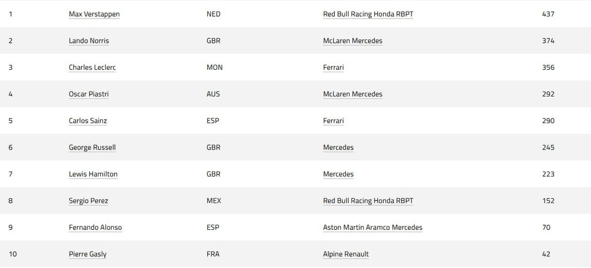 Напарник Ландо Норріса, австралієць Оскар Піастрі, приїхав десятим. Він стартував другим, але через зіткнення з пілотом Ред Булл Максом Ферстаппеном опинився в низу пелотону. Обидва пілоти отримали штраф у 10 секунд. Нідерландець, який достроково завоював четвертий титул, став шостим.