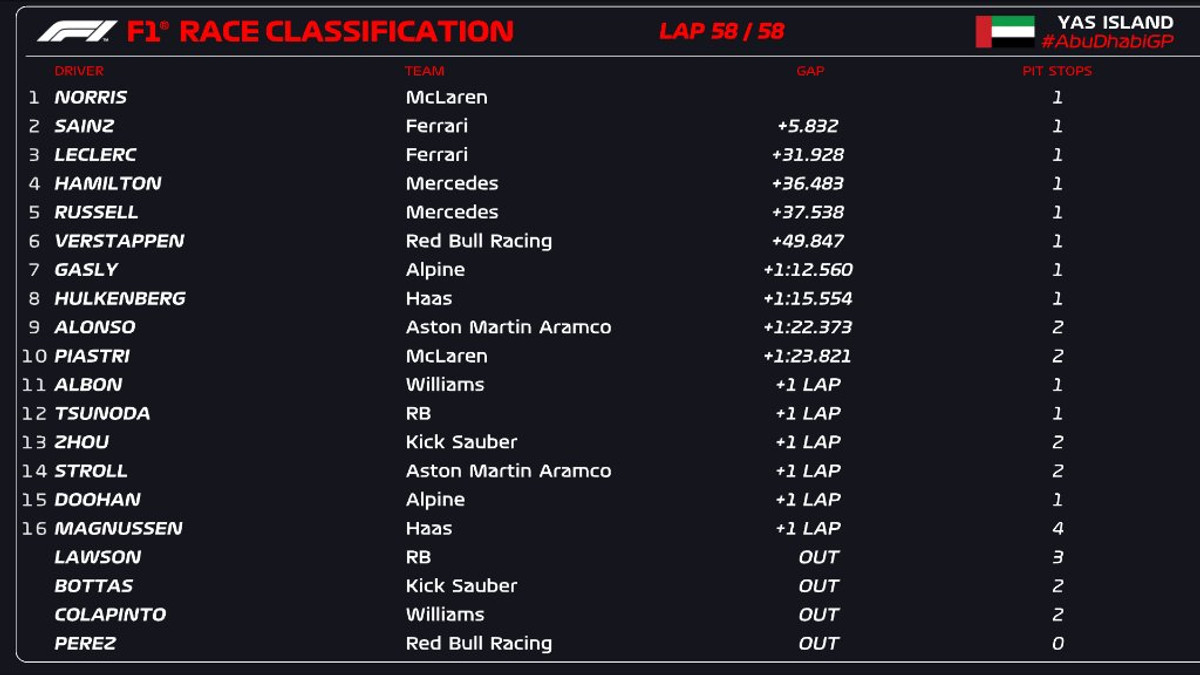 Феррарі ще могла претендувати на перемогу в Кубку конструкторів, однак успіх Норріса позбавив "червоних" шансів зайняти першу сходинку, а Макларен захистив своє лідерство.