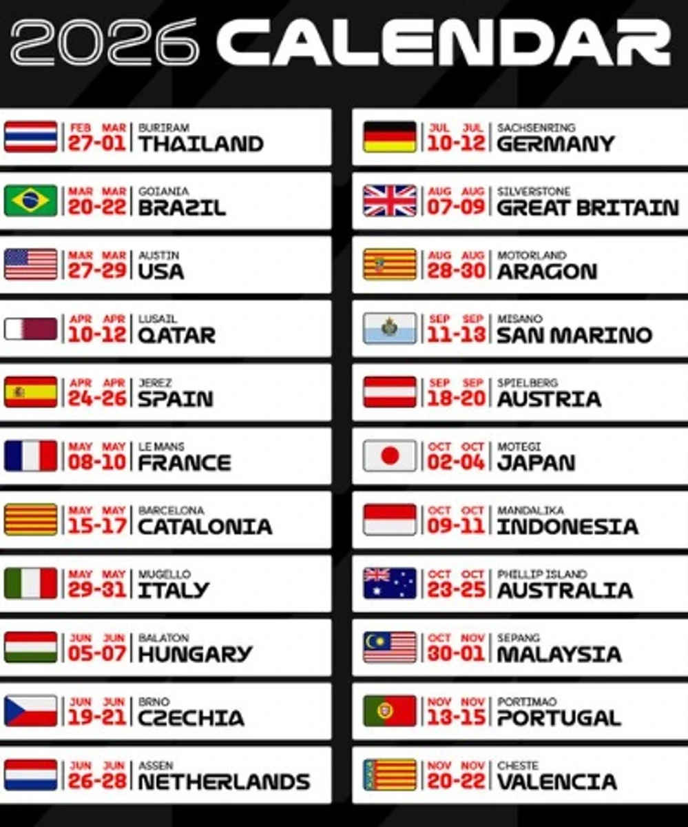 Як і в 2025 році, сезон складатиметься з 22 етапів і розпочнеться з Гран-прі Таїланду в Бурірамі. Другий етап відбудеться в Гоянії (Бразилія), замість Аргентини, а завершиться сезон у Валенсії, Іспанія.