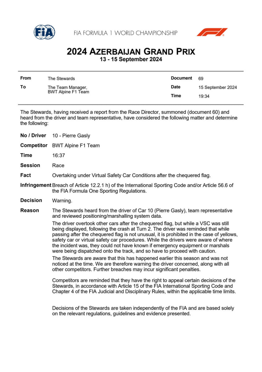 Також без покарань залишилися Макс Ферстаппен, Естебан Окон, П'єр Гаслі та Ніко Хюлькенберг. Вони здійснювали обгони під час дії віртуальної машини безпеки. Гонщикам озвучили попередження.