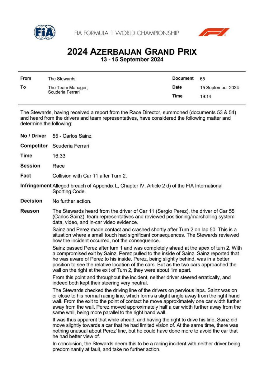 "Водночас, в лінії Переса не було нічого незвичайного, але він міг зробити більше, щоб уникнути зіткнення з болідом, який він краще бачив. На завершення, стюарди вважають, що це гоночний інцидент, в якому жоден з гонщиків не є переважно винним, і не вживатимуть ніяких подальших дій", — йдеться у звіті FIA.