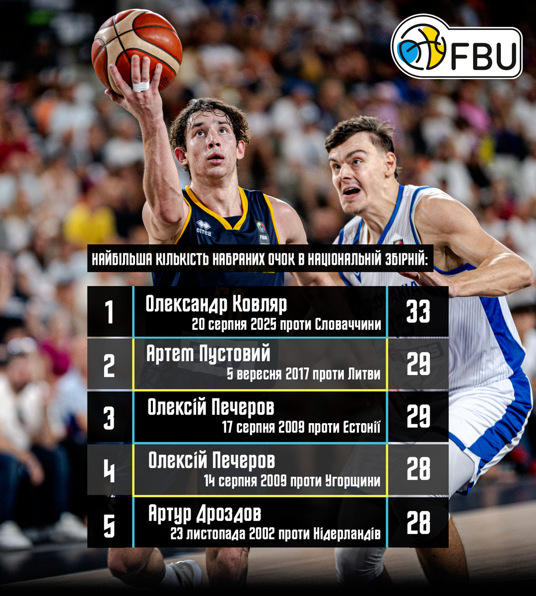 До цього рекордним показником результативності в одному матчі в збірній України були 29 очок Артема Пустового проти Литви на Євробаскеті-2017 та Олексія Печерова проти Естонії у 2009 році в кваліфікації до Євробаскету-2009.
