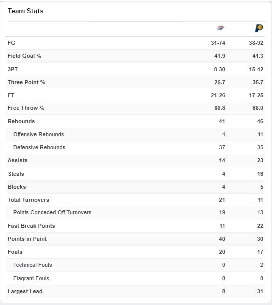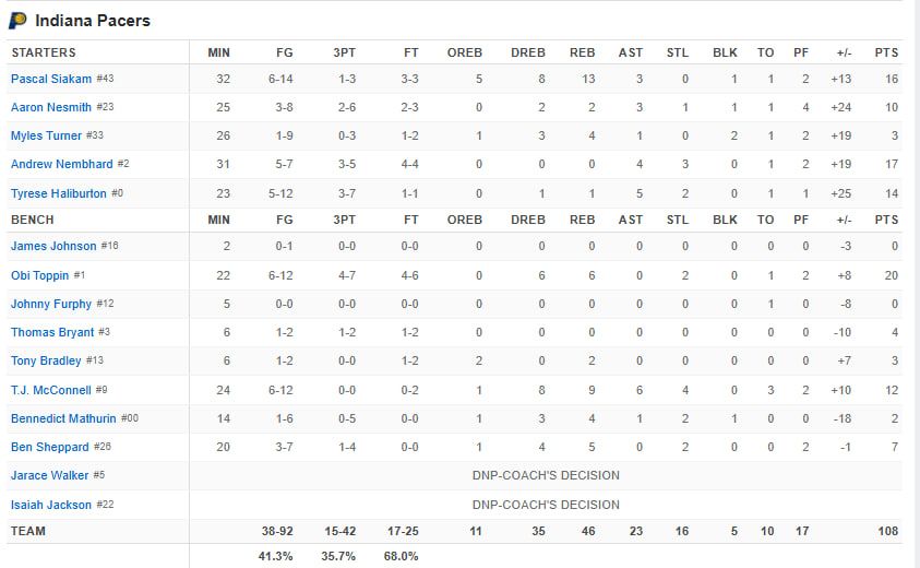 Найрезультативнішим у складі переможців став Обі Топпін, який набрав 20 очок і 6 підбирань. Нембхард додав 17 пунктів, а Паскаль Сіакам записав в актив дабл-дабл: 16 очок + 13 підбирань. Тайріз Халібертон з пошкодженням відзначився 14 очками.