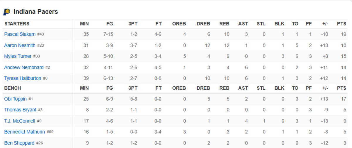 На цей раз "коліна затряслися" вже у суперника. Тернер не влучив дальній, у наступній атаці загрався Халібертон, потім 1/2 штрафних реалізував Сіакам. Переможець Заходу скористався цим – 108:99.