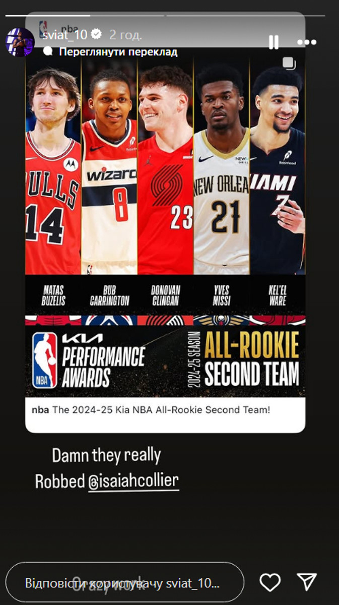 Свінгмен Юти та збірної України Святослав Михайлюк залишився незадоволений тим фактом, що його одноклубник Айзея Колльєр не опинився в жодній з символічних збірних новачків НБА.