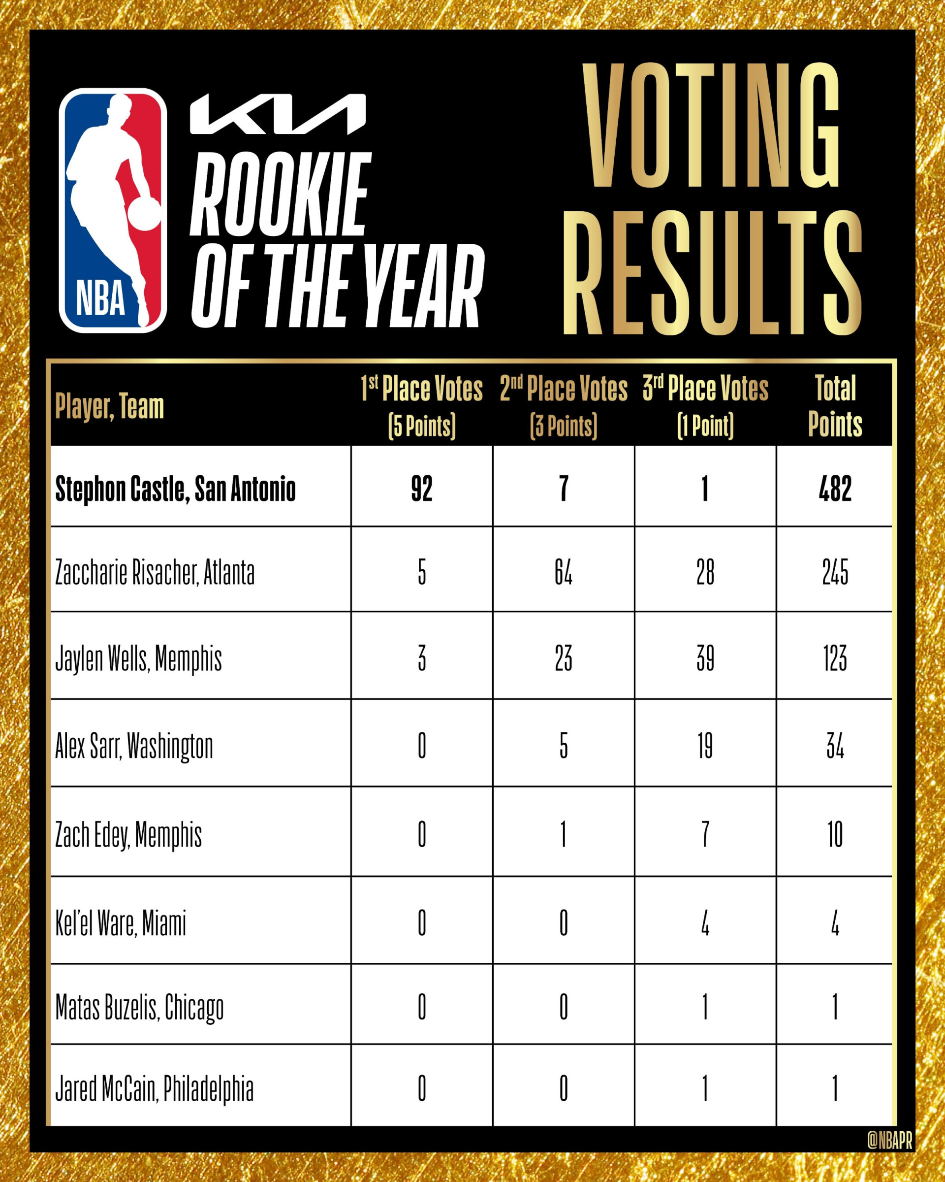 Стефон Касл став тільки четвертим гравцем, який отримав нагороду "Новачок року НБА" у складі Сперс, приєднавшись до Девіда Робінсона (1989/90), Тіма Данкана (1997/98) та лауреата минулого сезону Віктора Вембаньями (2023/24).