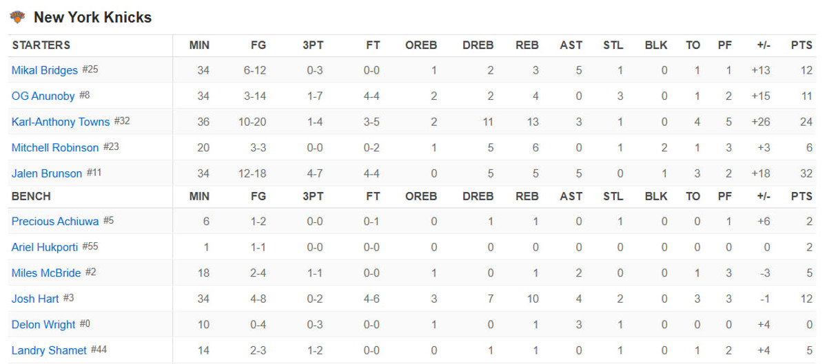 У складі Нікс виблискував Джейлен Брансон. Лідер команди набрав 32 очки і віддав 5 асистів. Карл Ентоні-Таунс відзначився дабл-даблом: 24 очки і 13 підбирань.