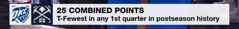 Як підсумок перших 12 хвилин поєдинку – рахунок 17:8 на користь Оклахоми. У сумі команди набрали 25 очок за чверть, що стало повторенням найгіршого результату в історії постсезону.