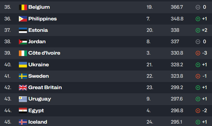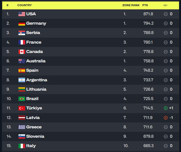 У першій п'ятнадцятці лише одна зміна. Збірна Туреччини обійшла Латвію і тепер є №11 у світі.