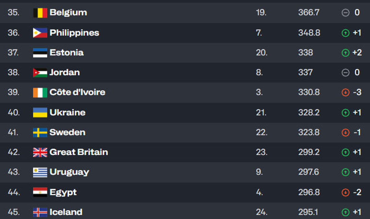У першій п'ятнадцятці лише одна зміна. Збірна Туреччини обійшла Латвію і тепер є №11 у світі.