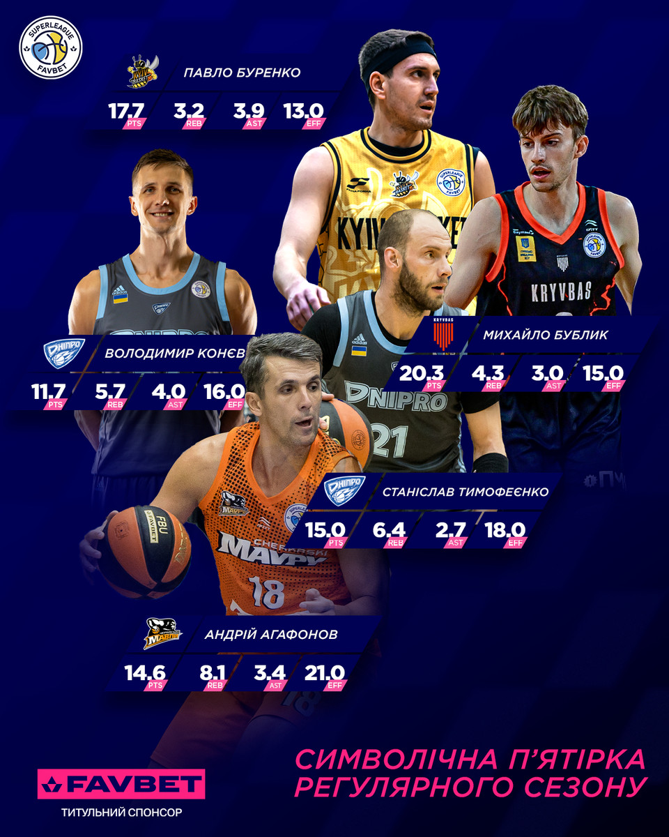 Так, до п'ятірки найкращих увійшло одразу два представника Дніпра, та по одному гравцю з Київ-Баскета, Черкаських Мавп та Кривбаса.