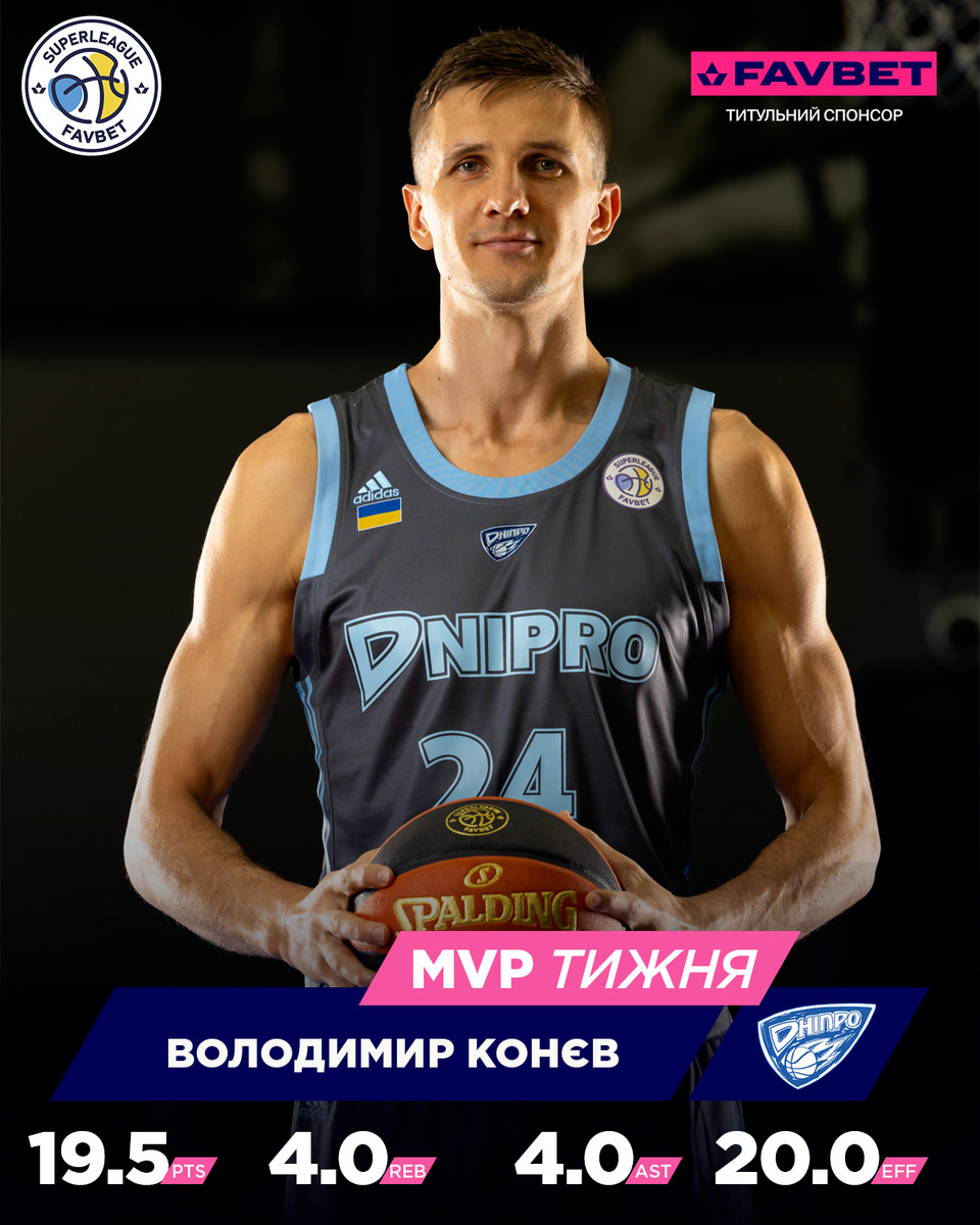 Форварда Дніпра Володимира Конєва визнали найкращим гравцем дев'ятого ігрового тижня Суперліги України за баскетболу.