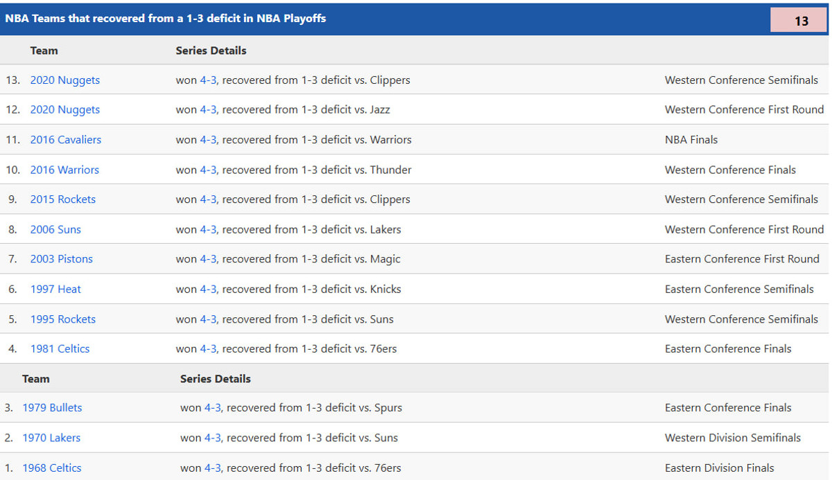 Як повідомляє Landofbasketball.com, за всю історію НБА таких випадків було 293. Лише 13 разів (4,4%) колектив, який відставав, зумів стати переможцем серії у підсумку.
