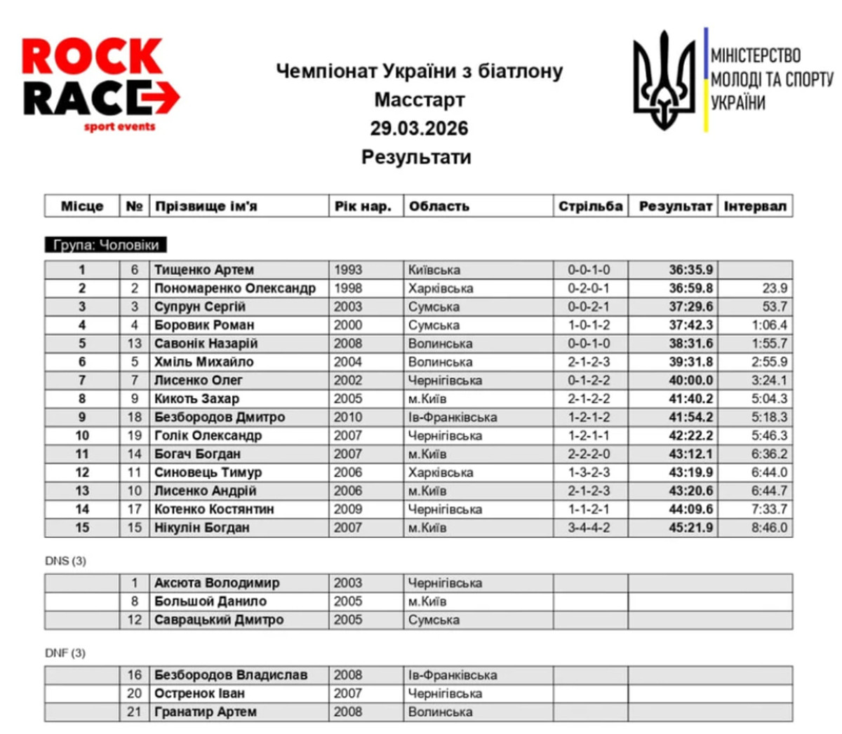 - 1. 🥇 Артем Тищенко (Київська область, 0+0+1+0) 36:35,9