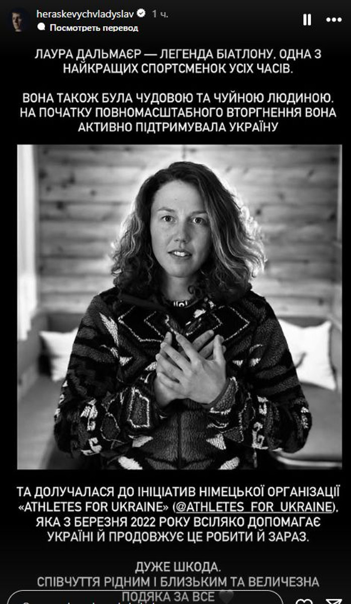 "Лаура Дальмаєр – легенда біатлону. Одна з найкращих спортсменок усіх часів. Вона також була чудовою та чуйною людиною. На початку повномасштабного вторгнення вона активно підтримувала Україну та долучалася до ініціатив німецької організації Athletes for Ukraine, яка з березня 2022 року всіляко допомагає Україні й продовжує робити це зараз.