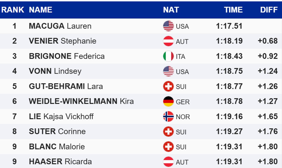 Несподівано виграла гонку її молода партнерка по команді Лорен Масуга, для якої це перша перемога в кар’єрі на Кубку світу. Компанію на подіумі їй склали господарка змагань, австрійку Стефані Венір, та переможець вчорашнього швидкісного спуску, італійка Федеріка Бріньоне.