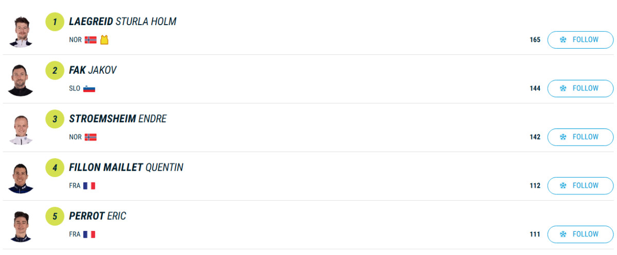 За три гонки кампанії 28-річний біатлоніст заробив 165 очок, що стало найкращим показником. Він випередив на 21 очко Якова Фака, який став переможцем заїзду, а також вирвав трофей у земляка Ендре Стрьомсгейма, який був лідером заліку перед стартом гонки.
