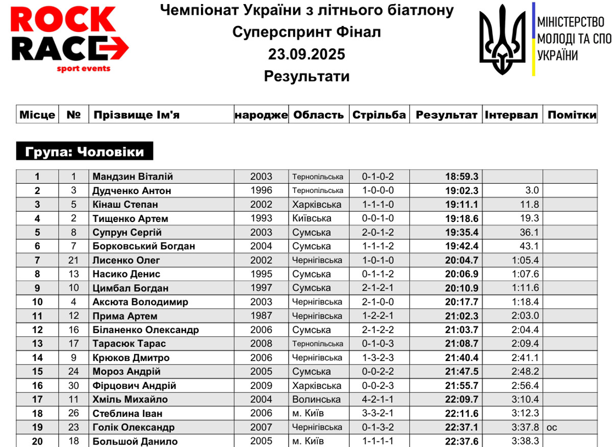 У межах чемпіонату України з літнього біатлону були розіграні нагороди у чоловічому суперспринті.