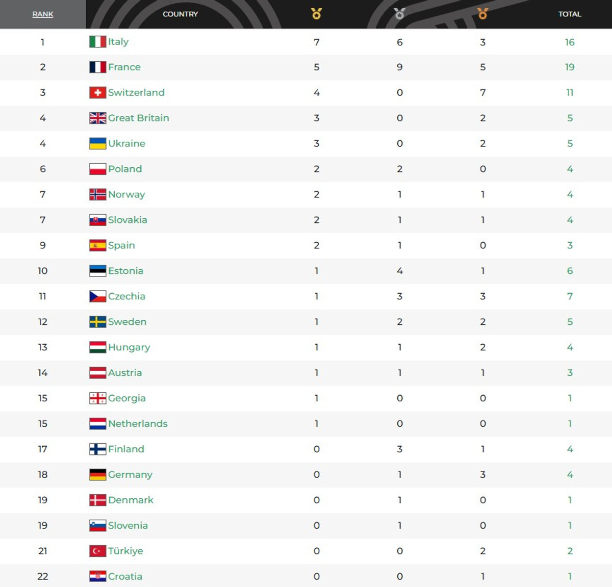 Перемогла в загальному заліку Італія, в активі якої 16 нагород (7-6-3), другою стала Франція (19 нагород: 5-9-5). Замкнула топ-3 збірна Швейцарії, яка здобула 11 медалей (4-0-7).
