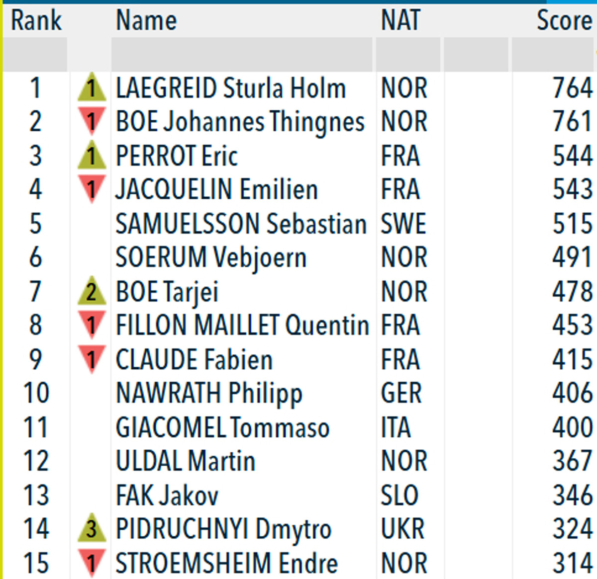 Таким чином, Легрейд наразі очолює загальний залік із 764 очками в активі. Бо відстає на три очки. Лідер збірної України Дмитро Підручний, який сьогодні став п’ятим, за підсумками спринта піднявся на три позиції та наразі йде 14-м з 342 очками в активі.