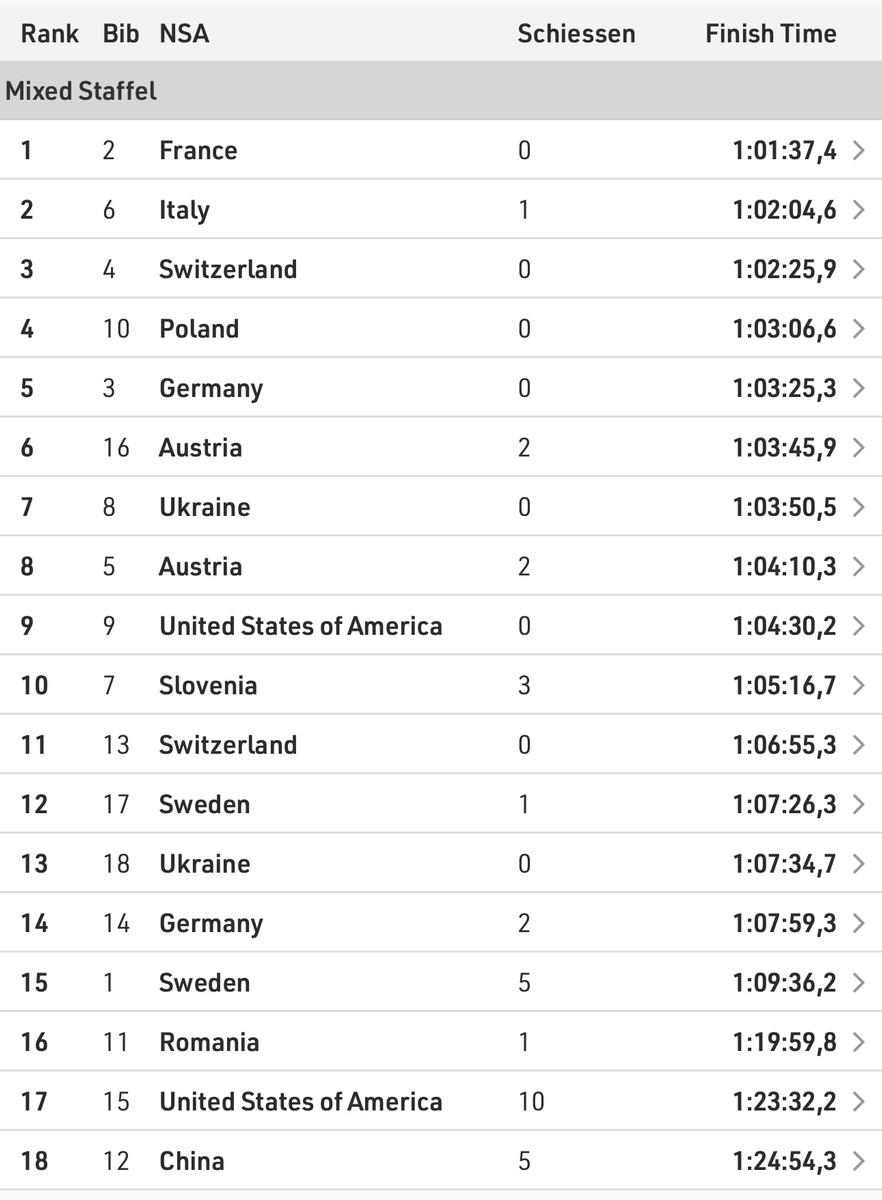 Перше місце у гонці посіла збірна Франції, яку представляли Лу Жанмонно, Паула Боте, Емільєн Клод та Ерік Перро, яким українці програли понад 2 хвилини.