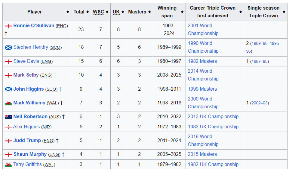 8-8-8 – це кількість перемог у трьох найпрестижніших змаганнях у снукері. Наразі О'Салліван має 8 перемог на UK Championship, таку саму кількість тріумфів на Masters, а ось чемпіонат світу йому підкорювався сім разів.