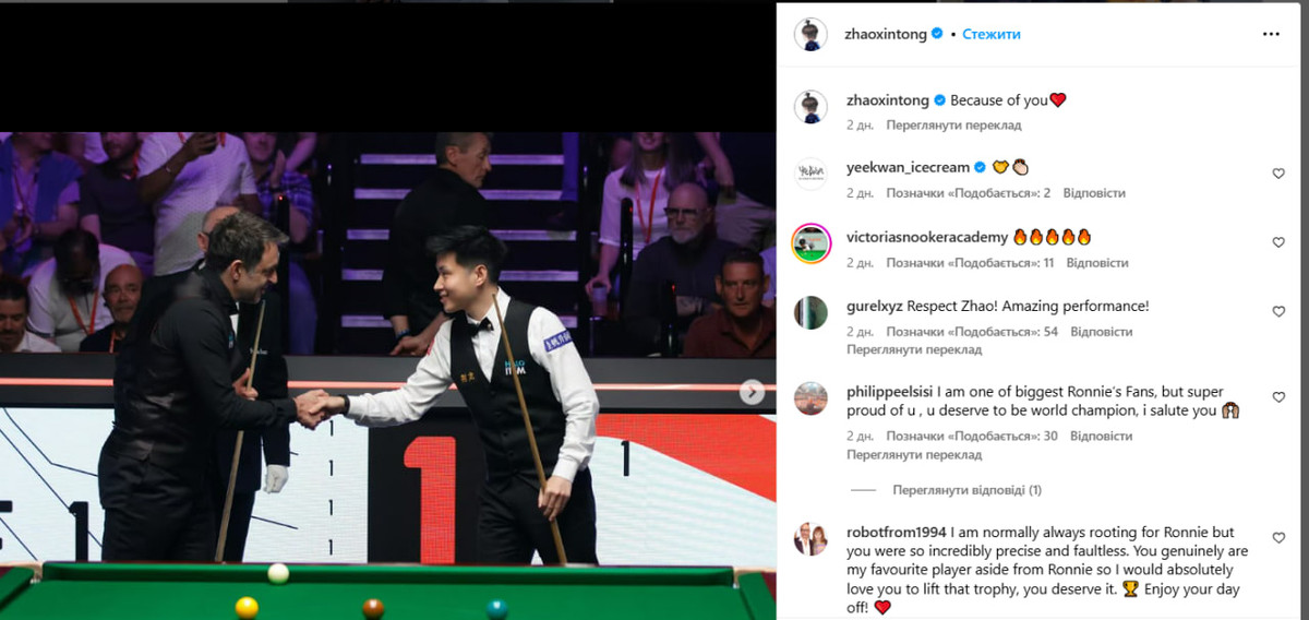Своєю перемогою пишався й сам Чжао, не забувши відзначити вплив легендарного О’Саллівана на власну кар’єру. Зокрема, він опублікував пост в Instagram із лаконічним підписом: "Because Of You."