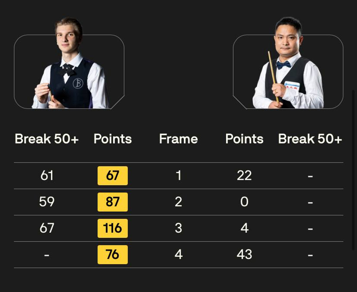 У кожному фреймі 19-річний українець діяв упевнено. Загалом за гру він набрав 346 очок, тоді як опонент всього 69. На рахунку Бойка три півсотенні серії.