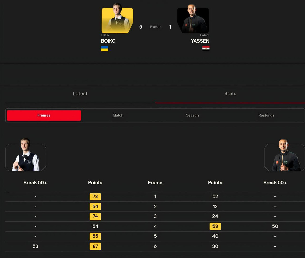 Снукеристи грали не дуже успішно в атаці. Кожен із них оформив по одному 50-очковому брейку.