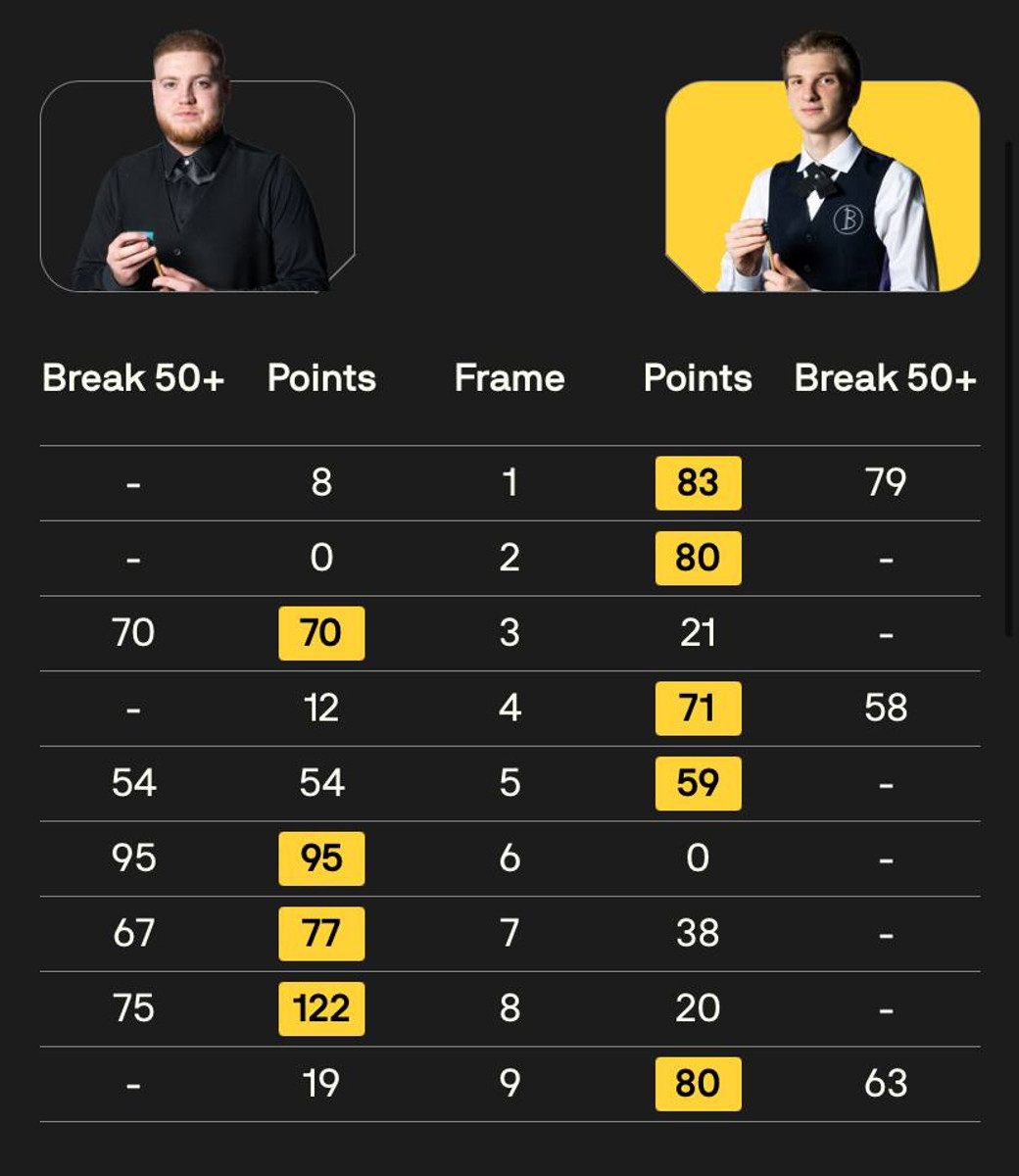 У четвертому фреймі Бойко оформив півсотню і відновив перевагу в два фрейми. П'ятий фрейм Луїс упевнено вів, але Юліан не здавався і зробив чудовий камбек – 59:54.
