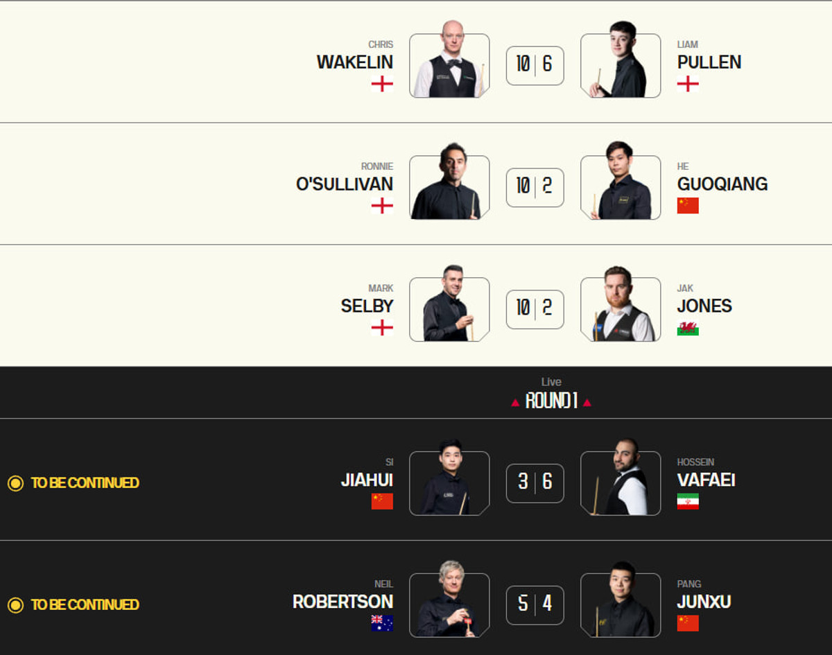 Ще дві гри будуть дограні сьогодні, 23 квітня. Іранець Хоссейн Вафаеї обігрує представника Китаю Си Цзяхуея (6-3).