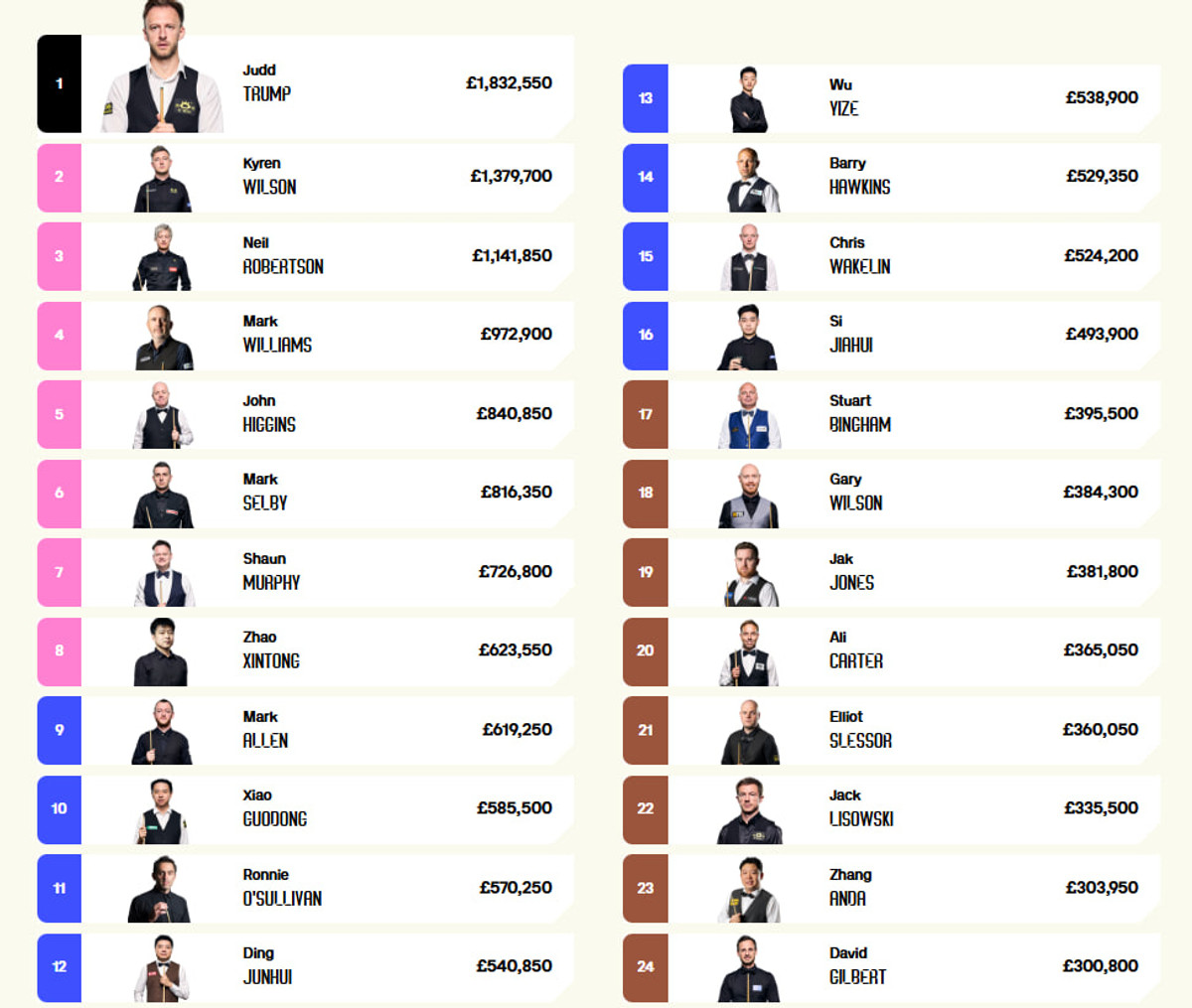 Перші 16 позицій рейтингу дозволять потрапити на чемпіонат світу в легендарному шефілдському "Крусіблі".