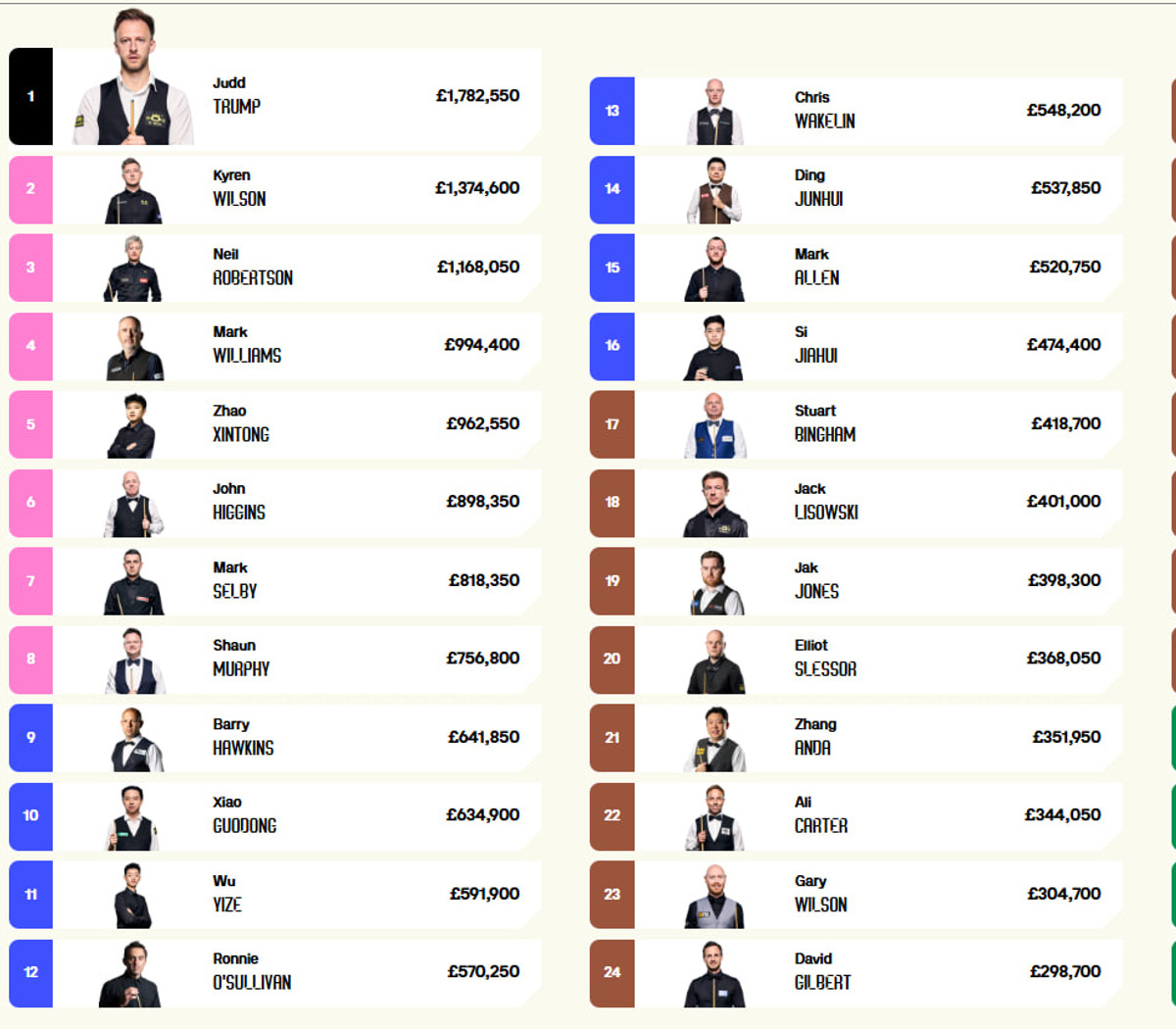 Легенда цього виду спорту Ронні О'Салліван не грав у Вельсі, тому не зумів захистити 15 000 очок, які набрав на Players Championship 2024. Через це він опустився на 12 місце.