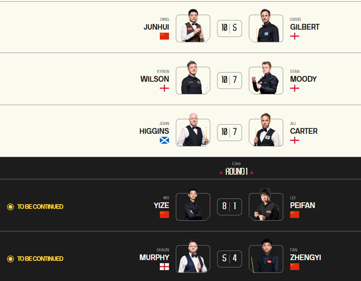 Ще два поєдинки будуть дограні вже сьогодні. Після першої сесії талановитий У Іцзе громить свого земляка Лея Пейфаня (8-1), а Шон Мерфі має проблеми з Фаном Чженьї (5-4).