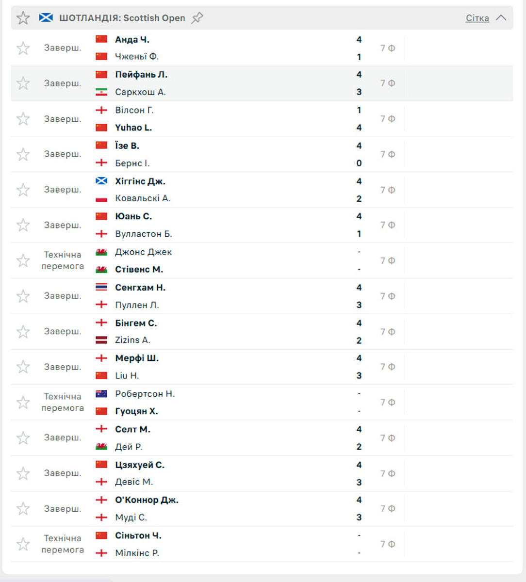 Головна сенсація сталася в матчі між Гері Вілсоном та Ланем Юйхао. 40-річний англієць, який ставав переможцем Scottish Open у 2022 та 2023 роках, програв гру 17-річному супернику з рахунком 1:4.