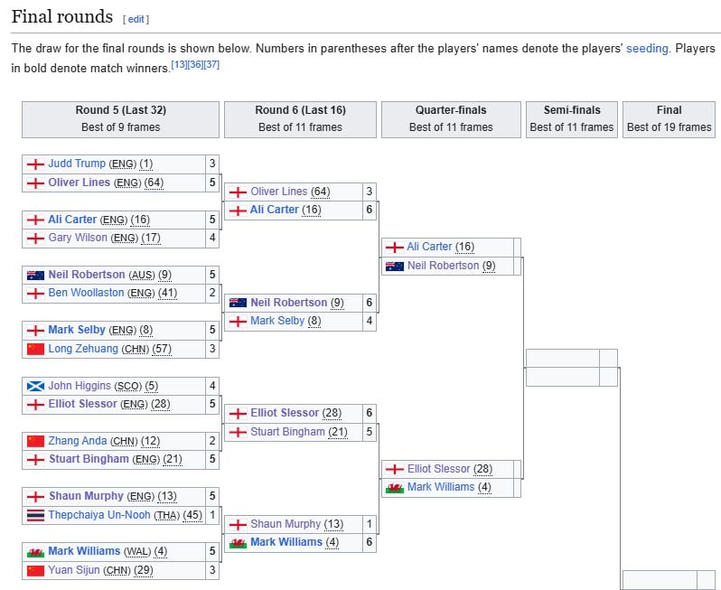 Кидається в очі і протистояння між колишніми лідерами світового рейтингу. Дуель Ніл Робертсон – Марк Селбі завершилася на користь австралійця.