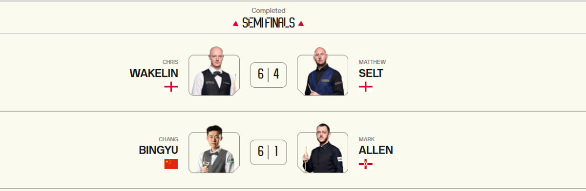 У другому півфіналі однозначним фаворитом був Марк Аллен, але китаєць здивував. Молодий суперник майже не помилявся. Сенсаційний виступ цього вечора показав, як Чан забив залікові брейки на 134, 108, 67, 68 та 57 очок, здобувши домінантну перемогу над своїм більш досвідченим суперником.