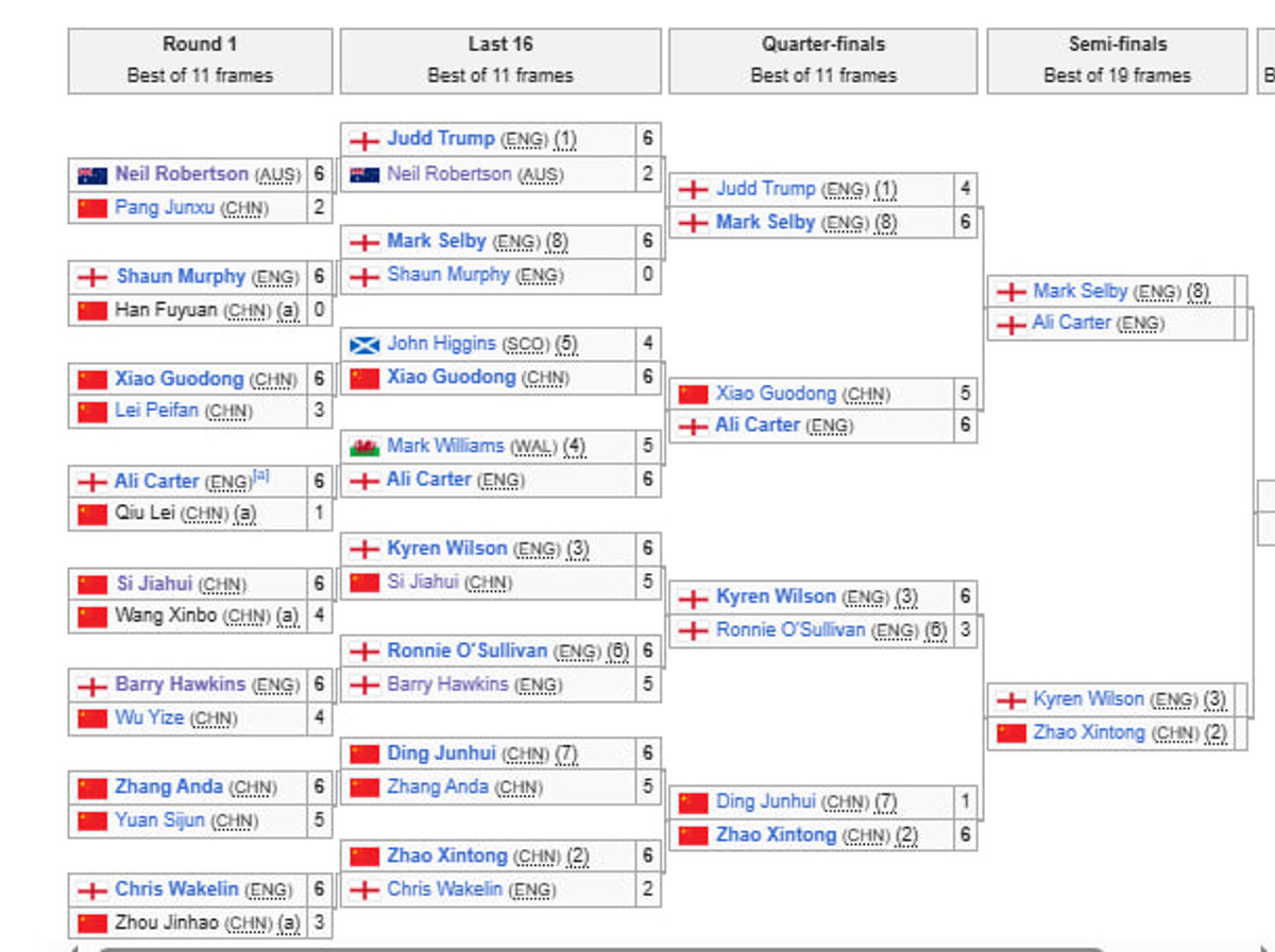 Єдиним представником Китаю в півфіналі буде чинний чемпіон світу Чжао Сіньтун, який обіграв земляка Діня Чжуньху (6:1).
