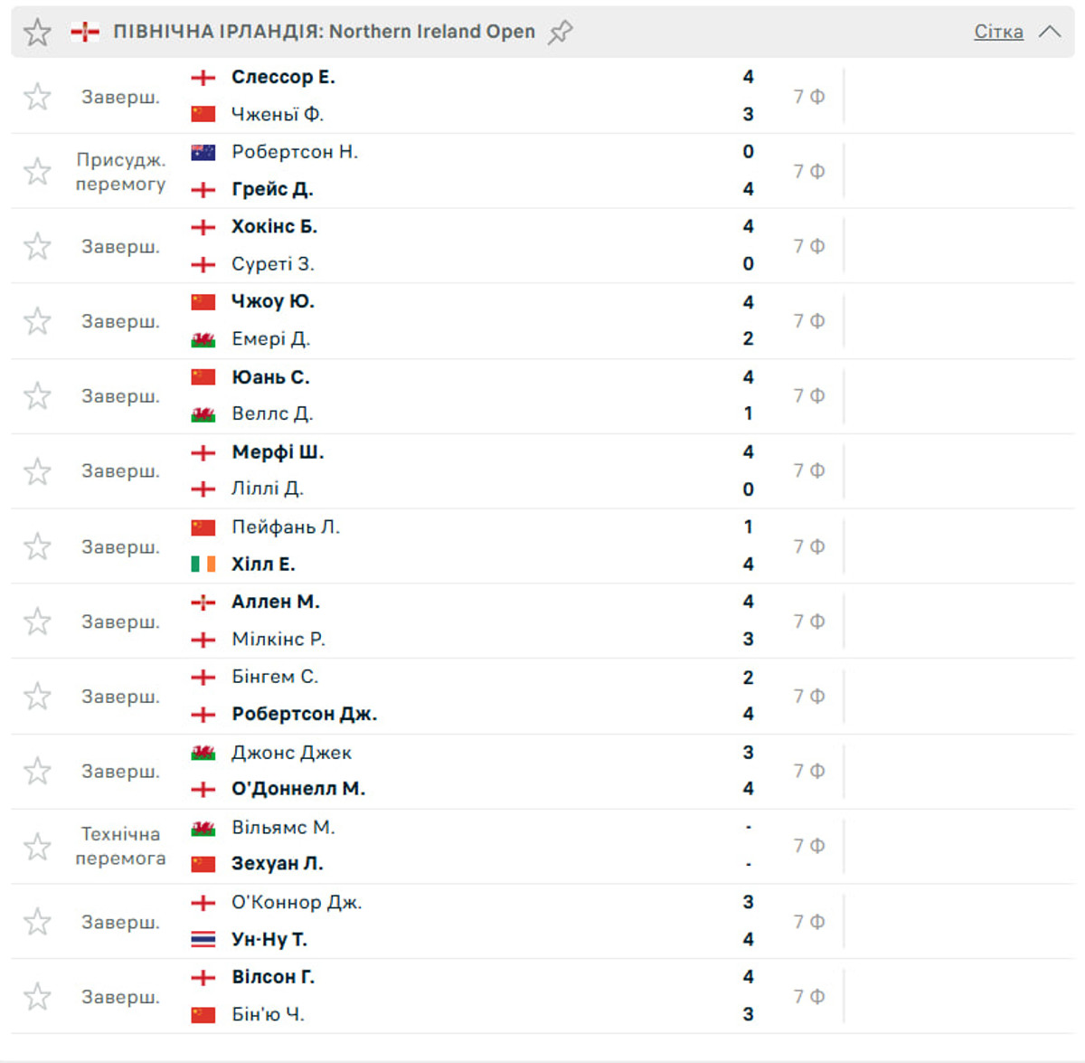 Ірландець Аарон Хілл без особливих проблем обіграв китайця Лея Пейфаня, який на ЧС-2025 у першому раунді вибив Кайрена Вілсона.