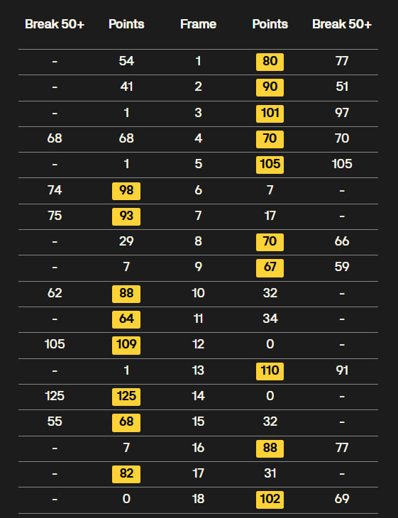 Джадд зробив рахунок 7:8, а потім 8:9. Фрейм №18 розпочався з тактичної боротьби, але Марк повів 69:0.