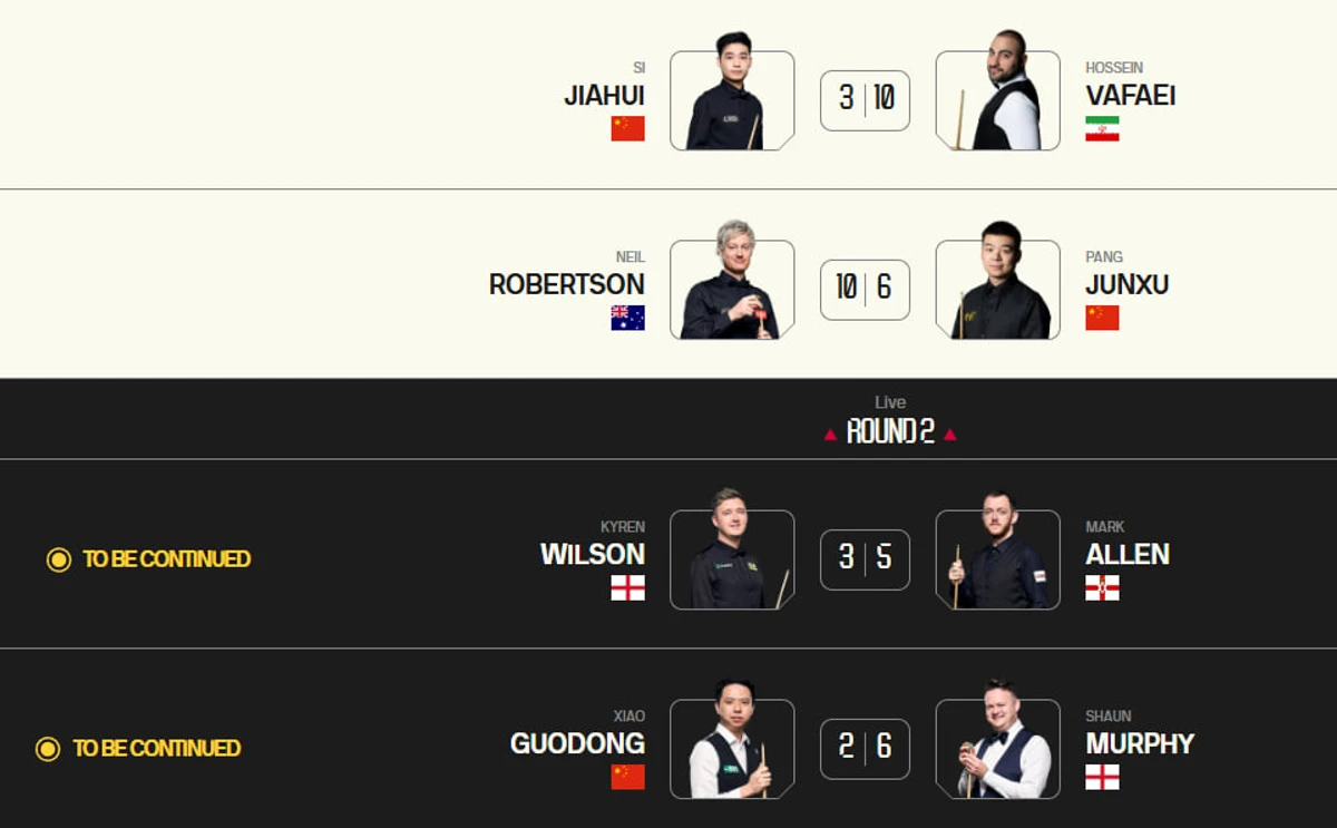 Останні путівки до другого раунду здобули іранець Хоссейн Вафаеї, який розгромив Си Цзяхуея (10-3), та Ніл Робертсон.