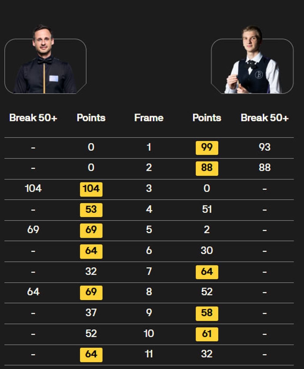 Перші два фрейми українець забрав досить впевнено, оформивши солідні брейки на 93 та 88 очок.