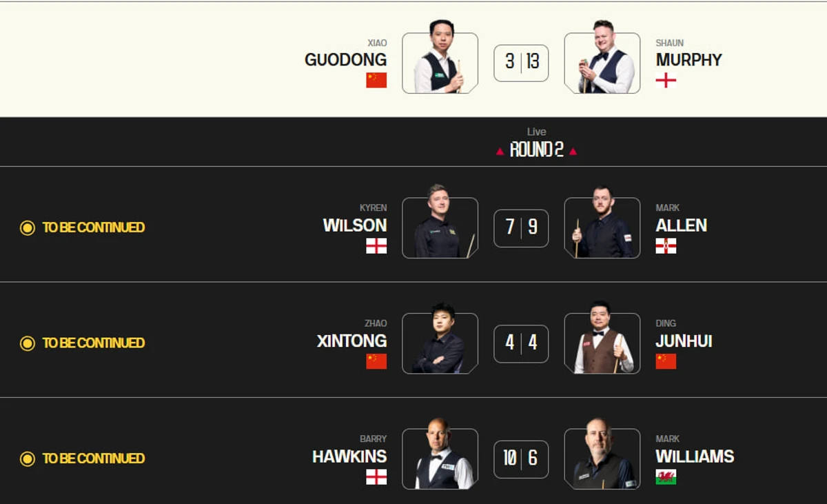 Перед загрозою вильоту опинився Марк Вільямс. Валлієць наразі програє з рахунком 6-10 Баррі Хокінсу.
