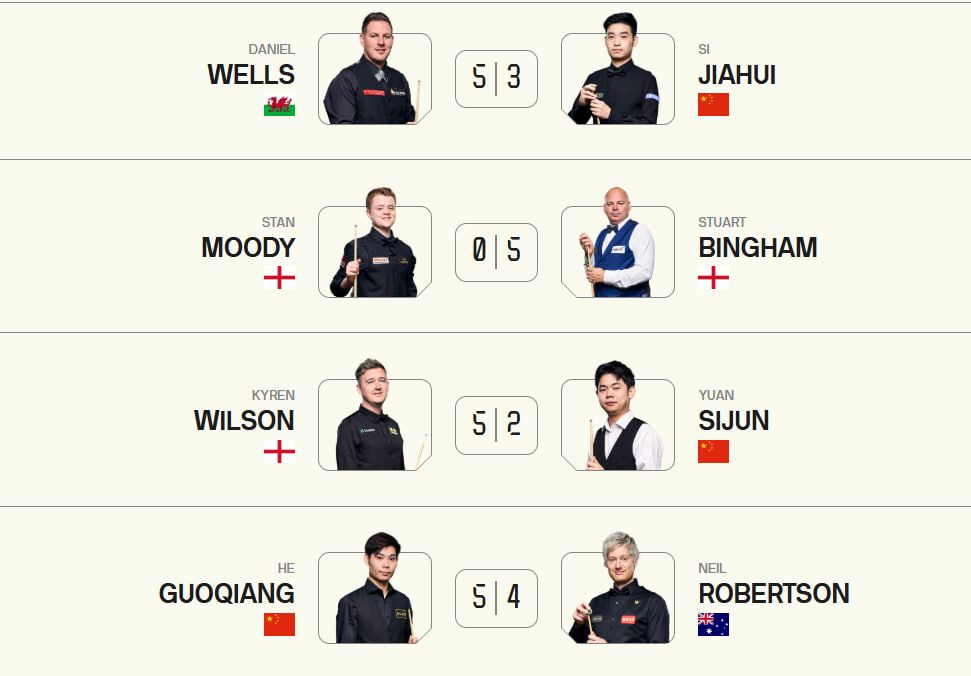 19-річний Стен Муді, який вважається головною надією Англії в снукеру, не мав шансів проти Стюарта Бінема. Чемпіон світу 2015 не залишив шансів своєму візаві – 5:0.