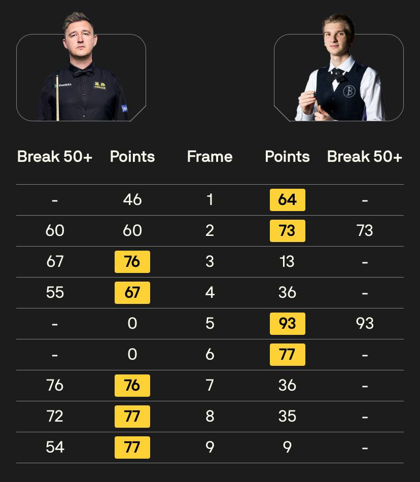 На перерву гравці пішли за рахунку 2:2. Схоже, відпочинок пішов на користь українця. Два поспіль фрейми причому "на суху": 93:0 та 77:0.
